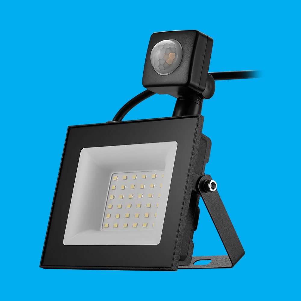 Powerful 30W LED flood light with automatic motion sensor and IP65 waterproof protection. Features cool white illumination, adjustable time delay, and day/night mode selection.